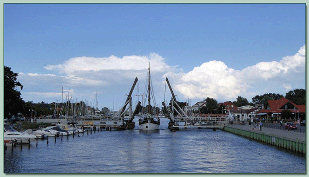 Weiterfahrt nach Ueckermünde, wo wir im Brauhaus“ Stadtkrug“ das Mittagessen einnahmen. Im Ort fand ein großes Hafenfest statt, welches viele kleine Schiffe und Boote angelockt hatte. Der Hafen, sehr lang, war durch eine Hebebrücke , welche im Jahre 2007 mit einem neuzeitlichen Hebelantrieb versehen worden war, abgeschlossen. Alle Stunde hob sich die Brücke, um Boote aus dem Hafen zu lassen.