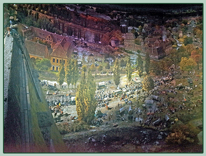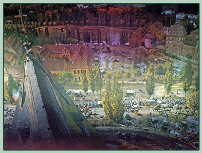 Auch auf dem Thomaskirchhof drängen sich flüchtende Soldaten und Zivilisten. Verwundete werden zwischen Gefallenen notdürftig versorgt. Asisi hat mit seinem Werk kein Schlachtenpanorama sondern ein Panorama gegen den Krieg schaffen wollen, wie er selbst sagte. Ein beeindruckendes Werk, das seine Wirkung nicht verfehlt hat. |