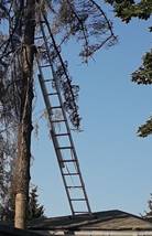 Das Bild zeigt einen Mitbürger, der auf eine etwas abenteuerliche Weise einen Baum zu bearbeiten oder gar zu fällen versucht (ungesicherte Leiter auf einer schiefen Ebene). Man kann den Sinn nicht genau erkennen. Aber, erkennen kann man die Gefährlichkeit seiner Aktion.