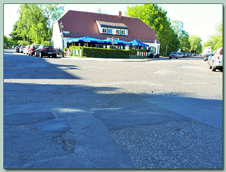 Ganz sicher. Es sind zwei Kreuzungen im Blumenviertel. Links die Kreuzung Konradenstr./Ehrenpreisweg und rechts die Kreuzung Krokus-/Prierosserstr. Die linke ist mit großem Aufwand umgebaut worden. Man hat die Bordstein-kanten abgesenkt. Eine Maßnahme, die bei den vielen Fußgängern und Behinderten, die hier tagtäglich die Kreuzung passieren, unumgänglich war. Nur vermissen wir die vielen Fußgänger. Hat jedenfalls eine Menge Geld gekostet. Geld, das man besser für die Kreuzung im rechten Bild ausgegeben hätte. Hier wird immerhin im wöchentlichen Rhythmus ein Teerklecks nach dem anderen verschmiert. Wir hatten unsere Bürgermeisterin auf unserer Novemberversammlung intensiv auf den unhaltbaren Zustand dieser Kreuzung aufmerksam gemacht. Sie hatte sogar mündlich versprochen, sich umgehend darum zu kümmern. Noch ist nichts geschehen. Jedoch gehen hier täglich sehr viele Passanten über die Kreuzung. Auch Radfahrer kommen oft in tiefe Löcher. Motorisierte Fahrzeuge rumpeln täglich mit überhöhter Geschwindigkeit über die Schlaglöcher. Vielleicht liegt dieser Vorgang noch als Hinterlassenschaft auf dem Amtsschreibtisch und ihr Nachfolger wird sich, wenn er sich in sein Amt eingearbeitet hat, darum kümmern. Wir haben die Hoffnung nicht verloren und warten auf ein Wunder.